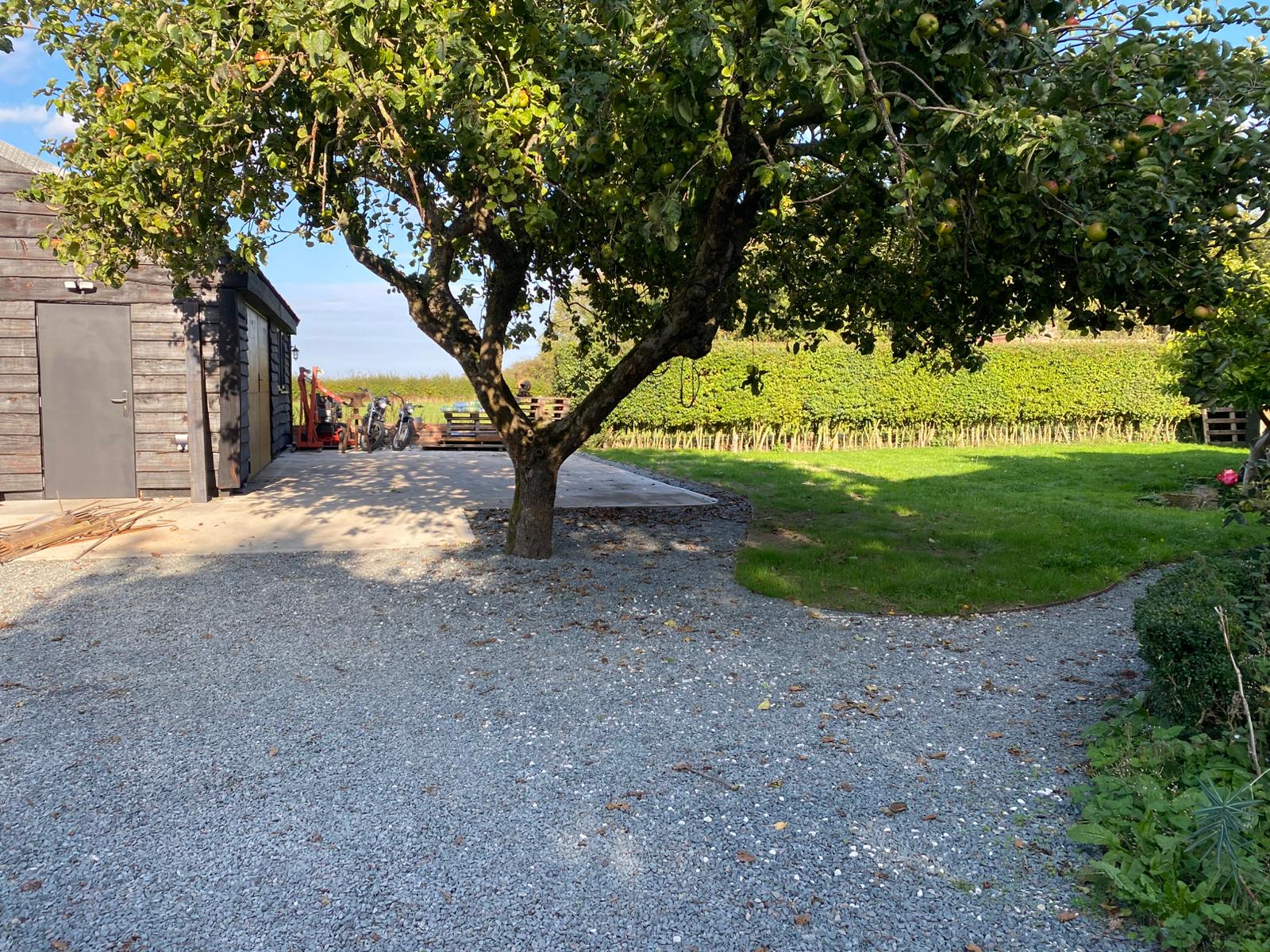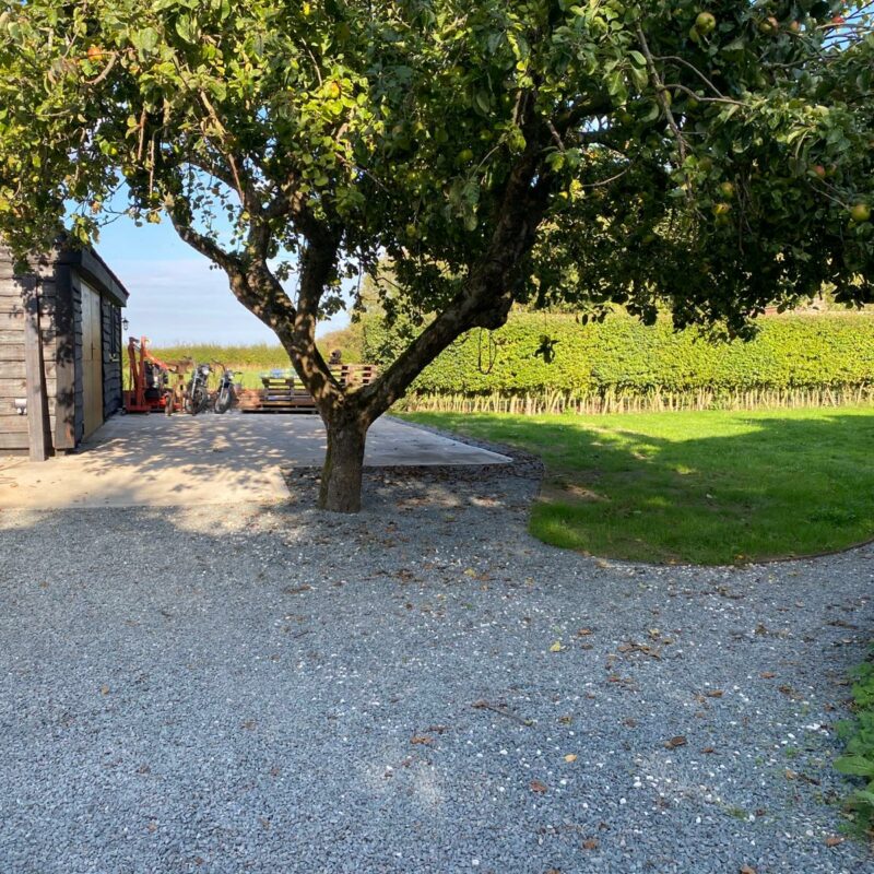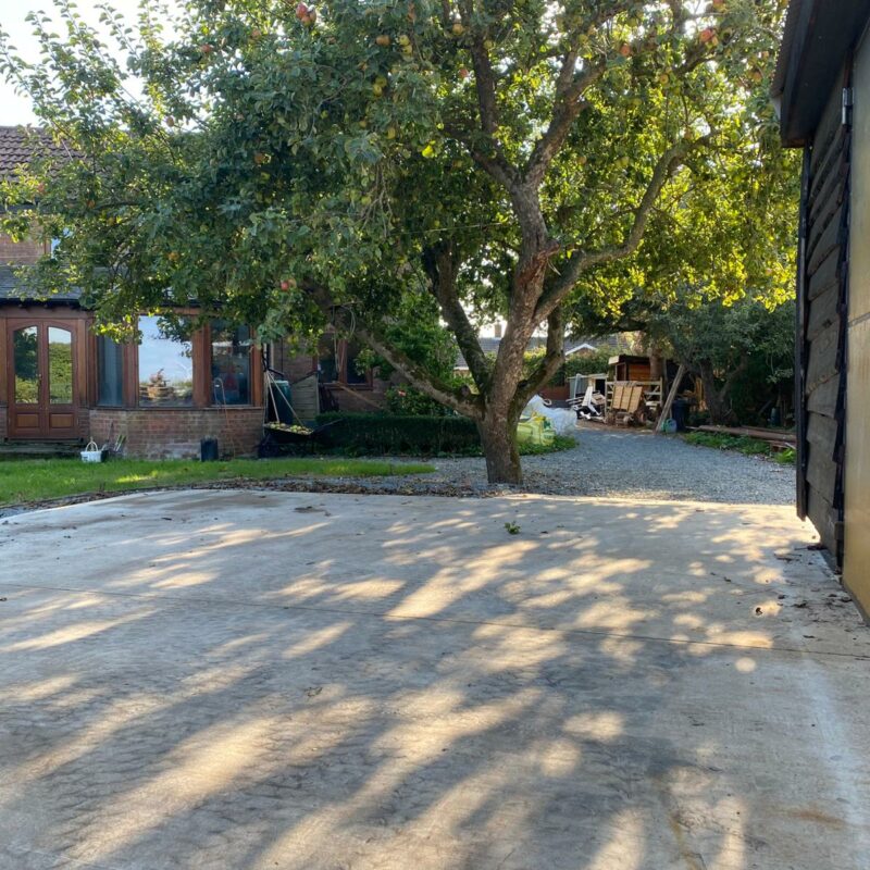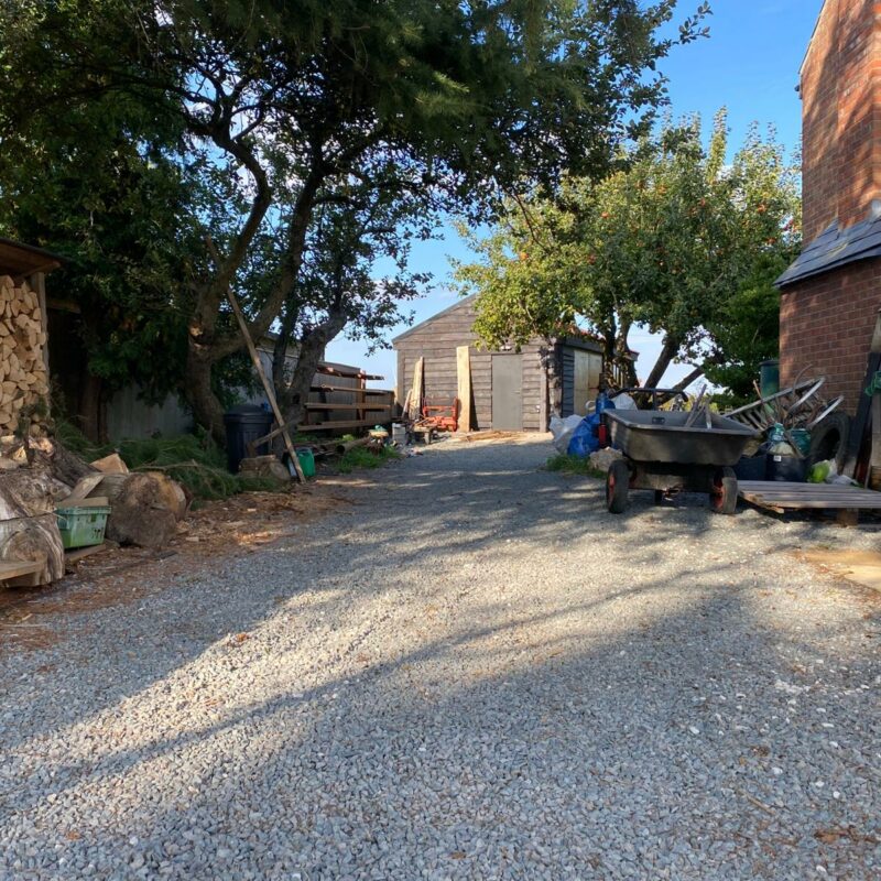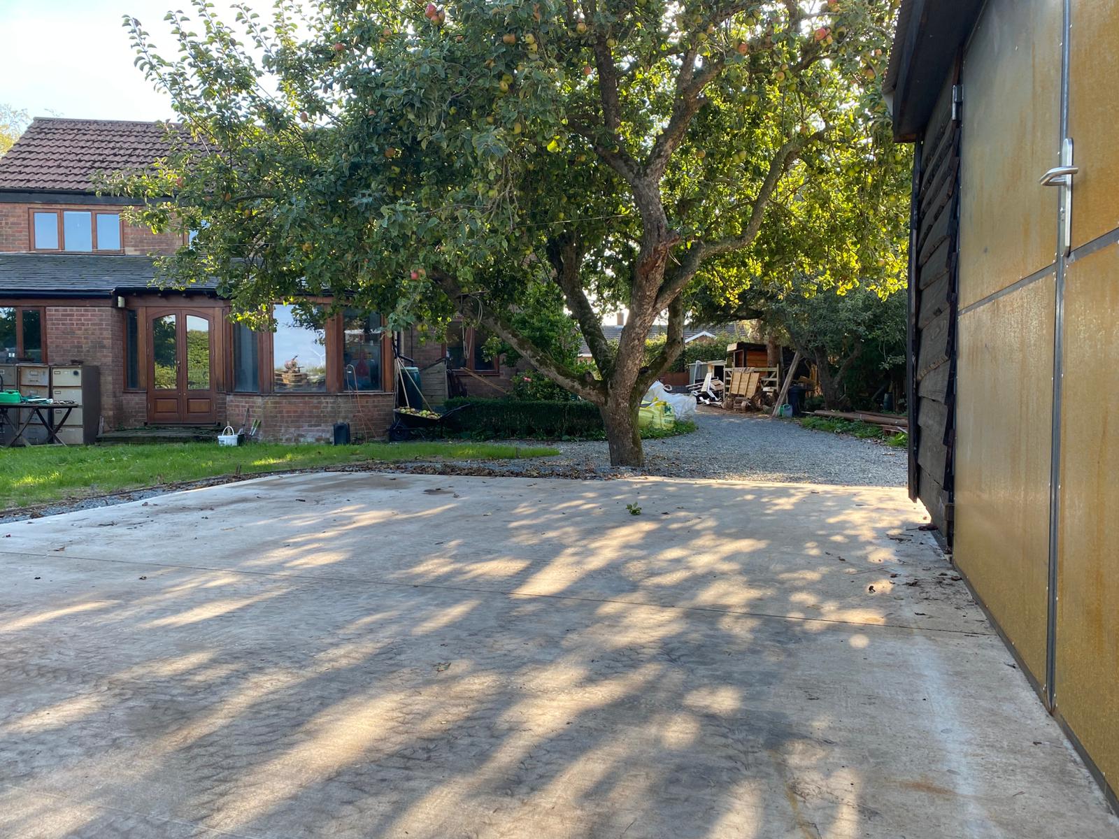 The spacious gardens extend to approximately one third of an acreage and include a concrete off street parking area for at least five cars with potential for creating further off street parking if required . There are a number of fruit trees and good size lawn to the rear of the house as well as shrub and flower beds, a wood store and a patio area to the front of a brick workshop. At the far side of the house is a further lawn which includes the underground LPG gas storage tank.