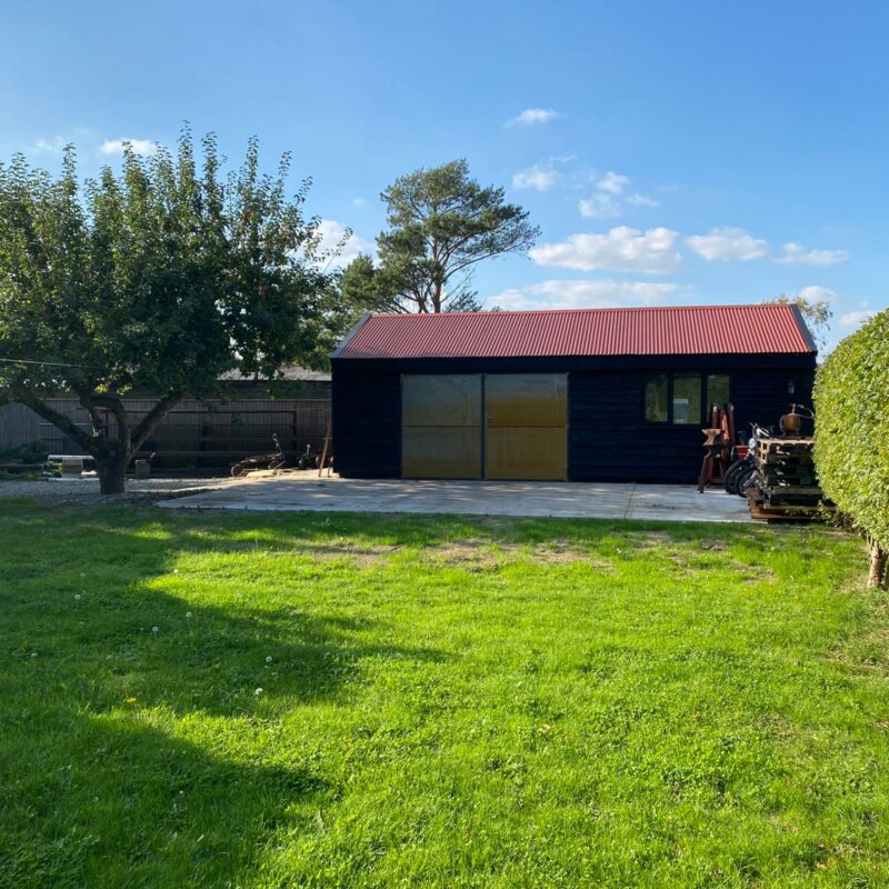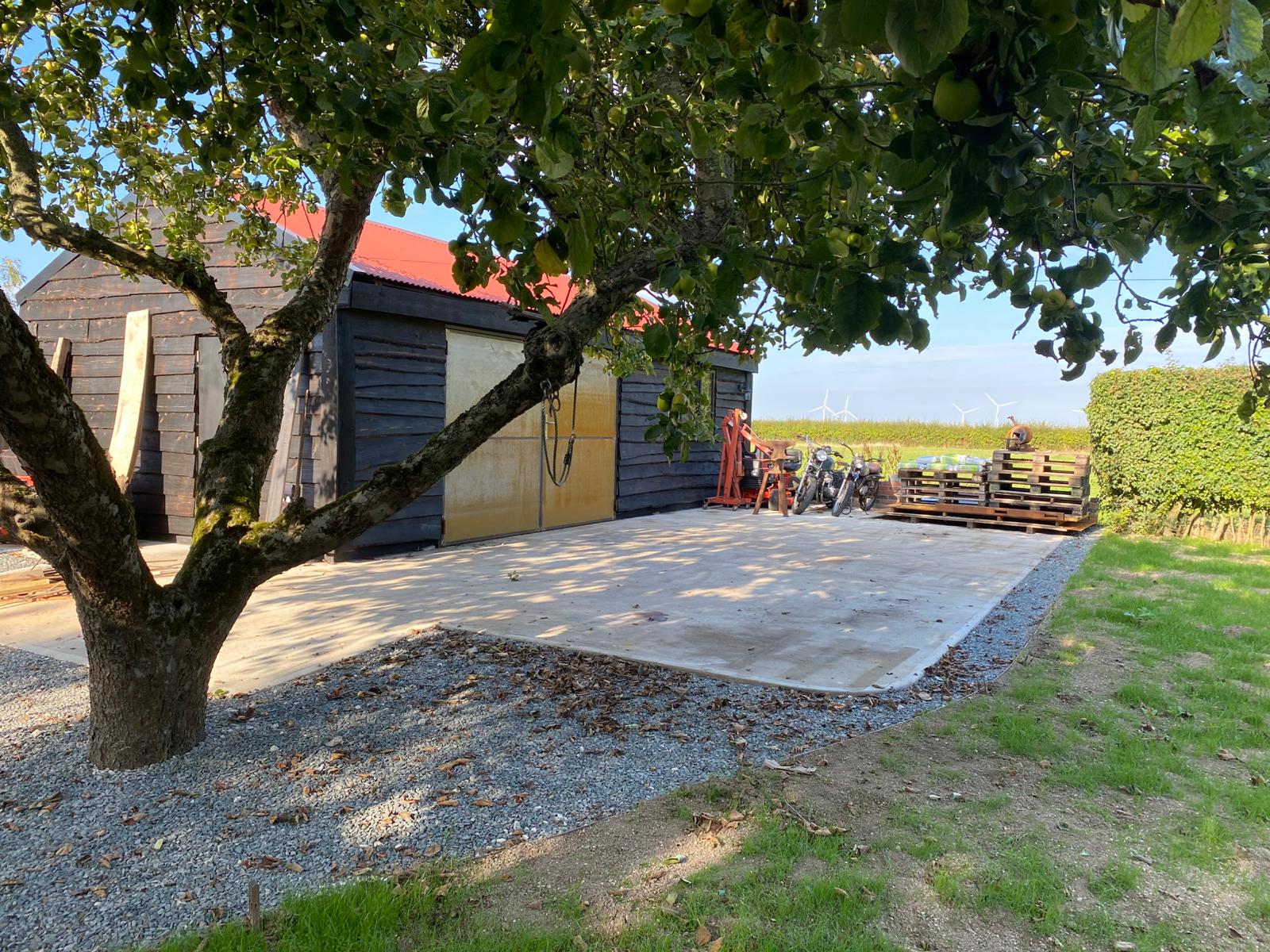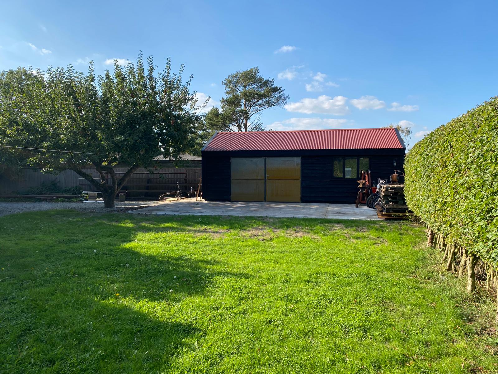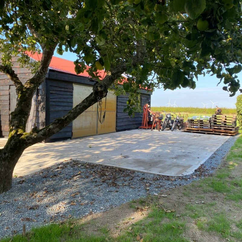 The spacious gardens extend to approximately one third of an acreage and include a concrete off street parking area for at least five cars with potential for creating further off street parking if required . There are a number of fruit trees and good size lawn to the rear of the house as well as shrub and flower beds, a wood store and a patio area to the front of a brick workshop. At the far side of the house is a further lawn which includes the underground LPG gas storage tank.