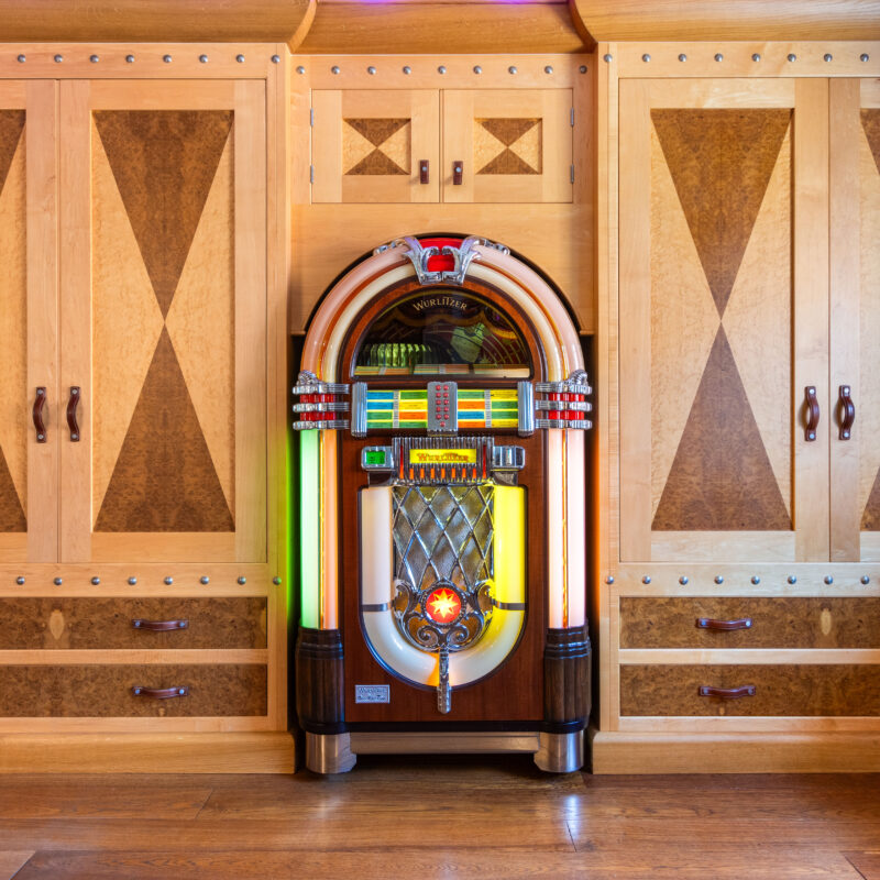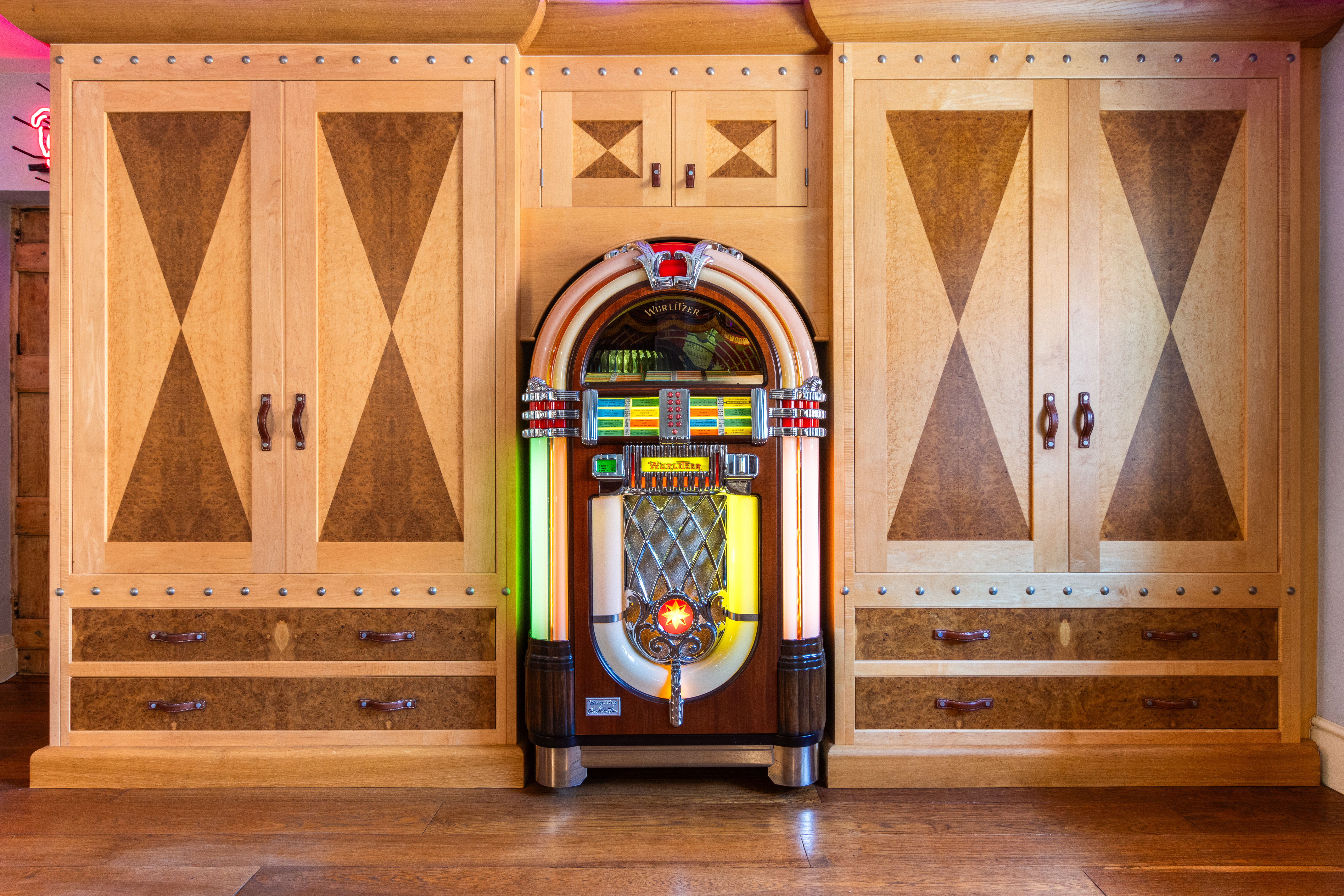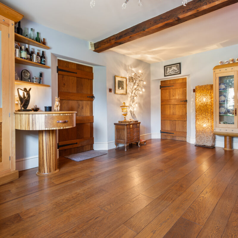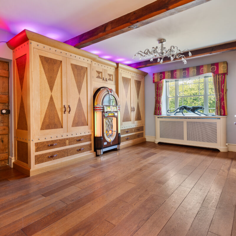With fitted bespoke two tone burr oak & birch wood built in furniture made by Chiselwood of Lincoln and comprising a lit glass shelved drinks cabinet with granite base and drawers below, high-level storage cupboard, built in fridge and shelving with drawers below, mirror fronted corner cloaks cupboard, an individual circular pedestal table crafted in Zebra wood and a modern glass fronted display unit with glass display shelving. Solid wooden flooring, decorative radiator cover, sash window and ceiling beams.