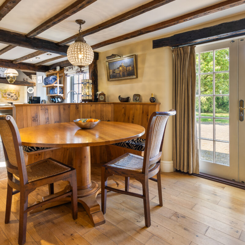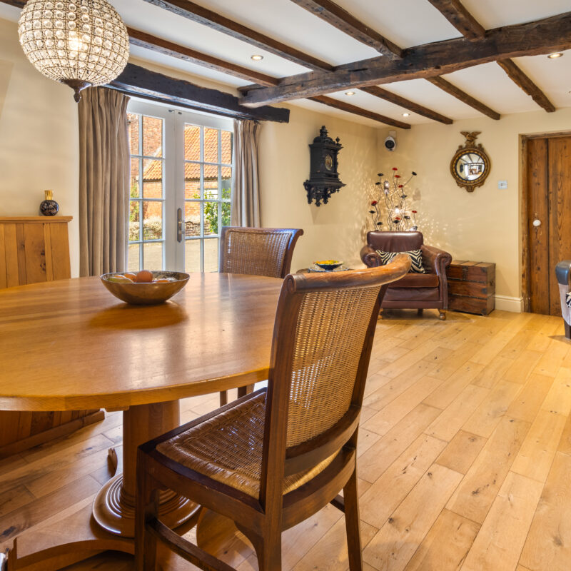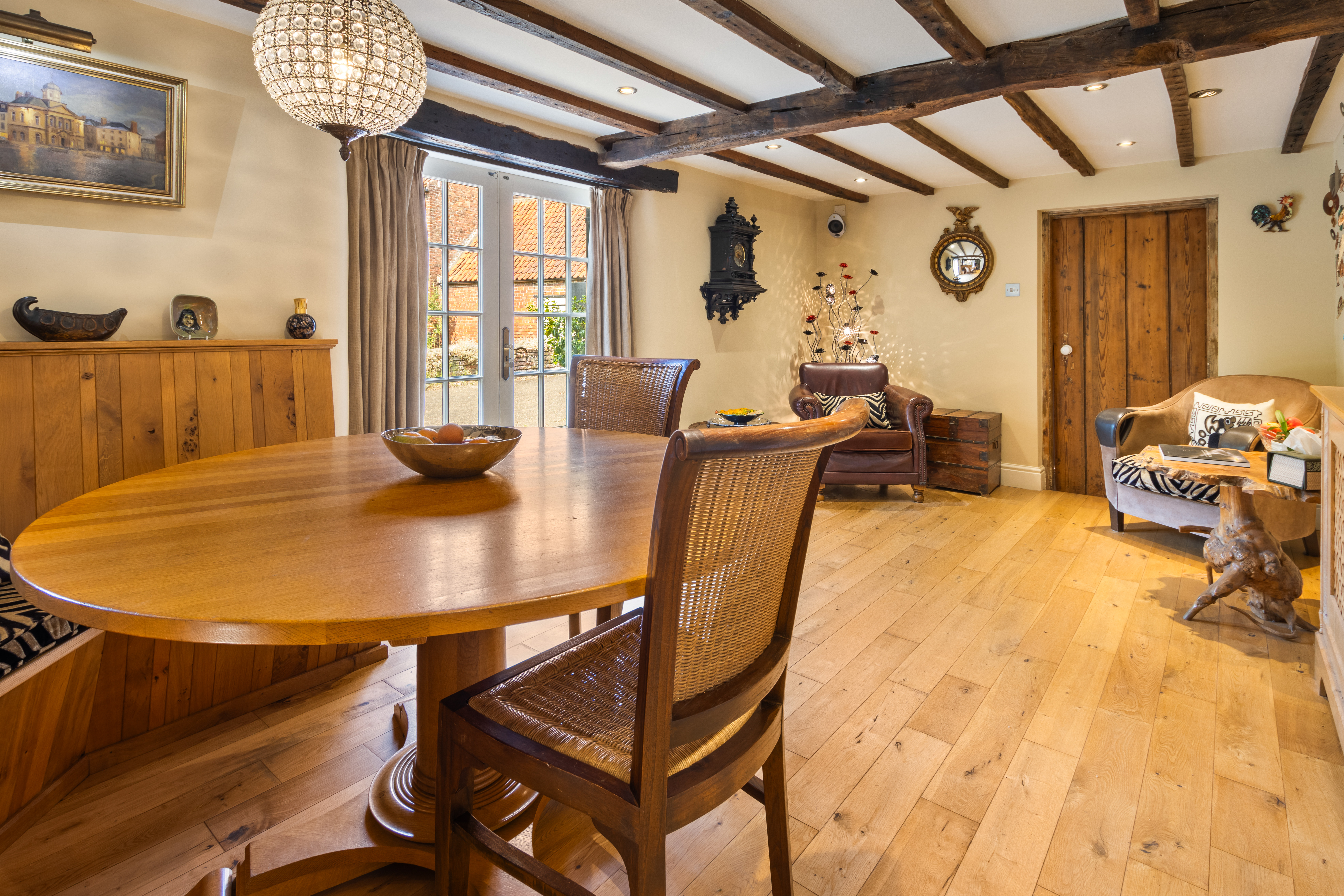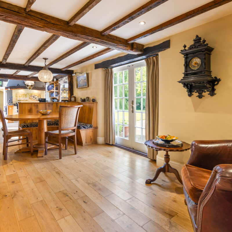 With external double doors enjoying views of the side gardens and pond,, wood flooring, timber ceiling beams, radiator with decorative cover.