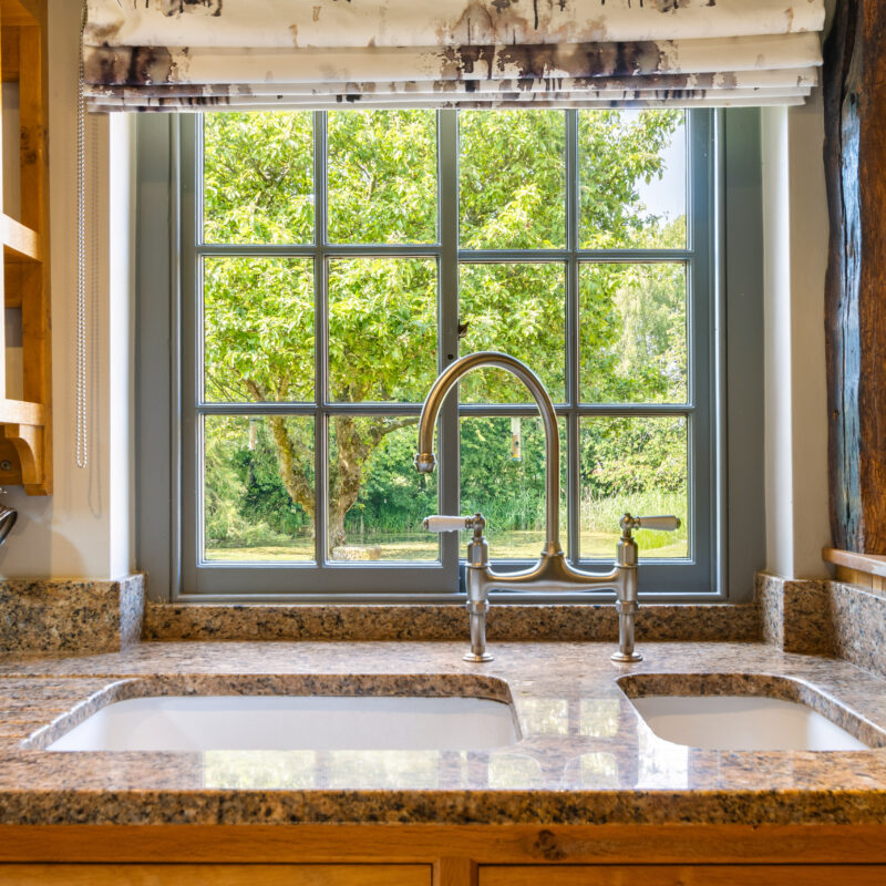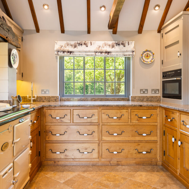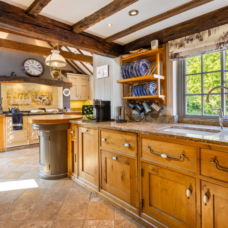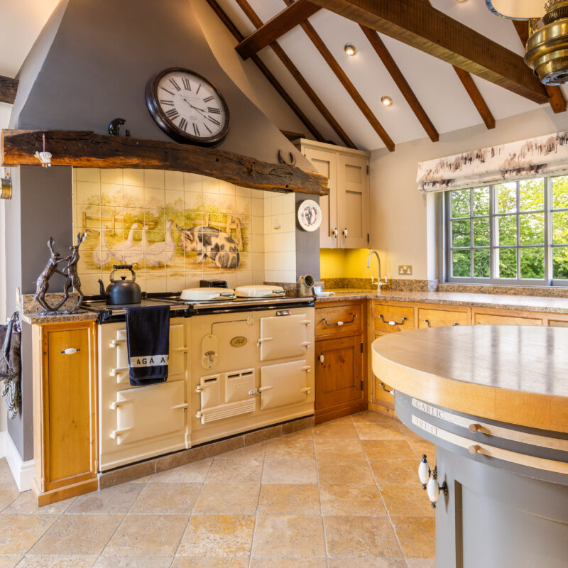 The kitchen area is fitted with Mark Wilkinson bespoke traditional style oak and painted handmade units having granite worktops over, inglenook chimney recess having shaped wooden beam over and housing Aga oil fired range cooker with splash tiling behind, integrated Miele microwave, limestone tiled flooring, pantry style cupboard, side sliding sash windows, exposed ceiling timbers, Velux skylights, external door opening to garden patio area, porcelain 1 1/2 bowl sink and ingrained granite drainer board, space for American fridge freezer.4.26m wide x 3.74m (13'11" x 12'3") & 3m x 2m. (9'10 x 6'6")