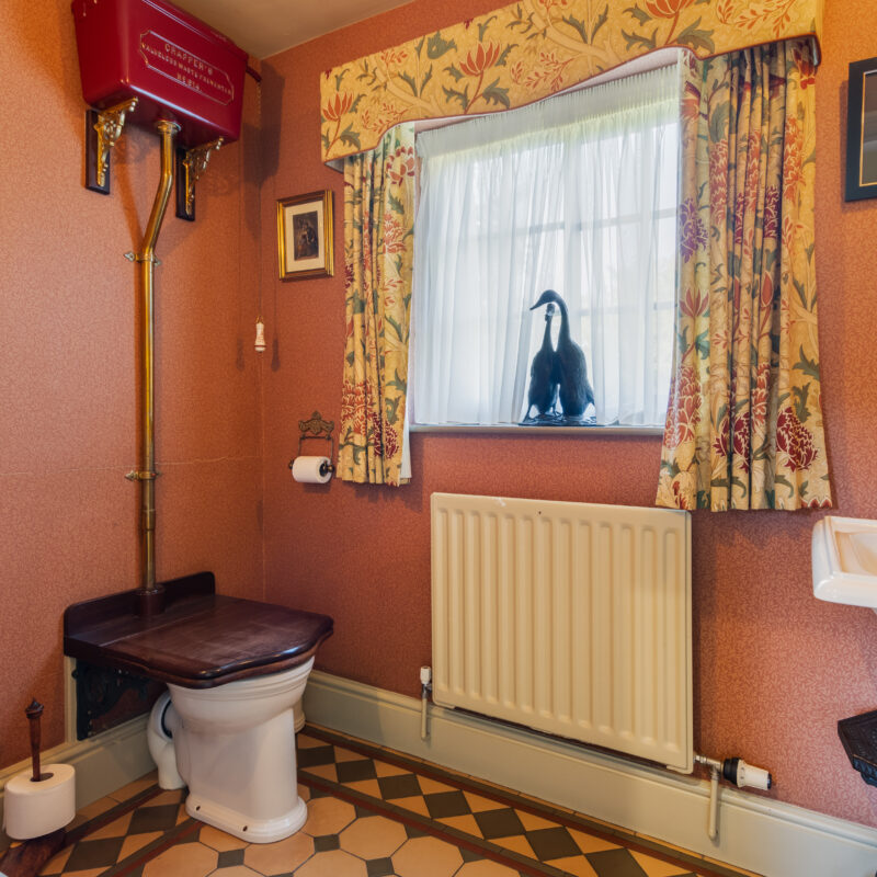 With Thomas Crapper Victorian style high level cistern toilet and mahogany throne seat, ornate Thomas crapper ornate Victorian style wash basin with brass taps & tiled splashback, Victorian style tiled flooring, side sliding sash window and radiator
