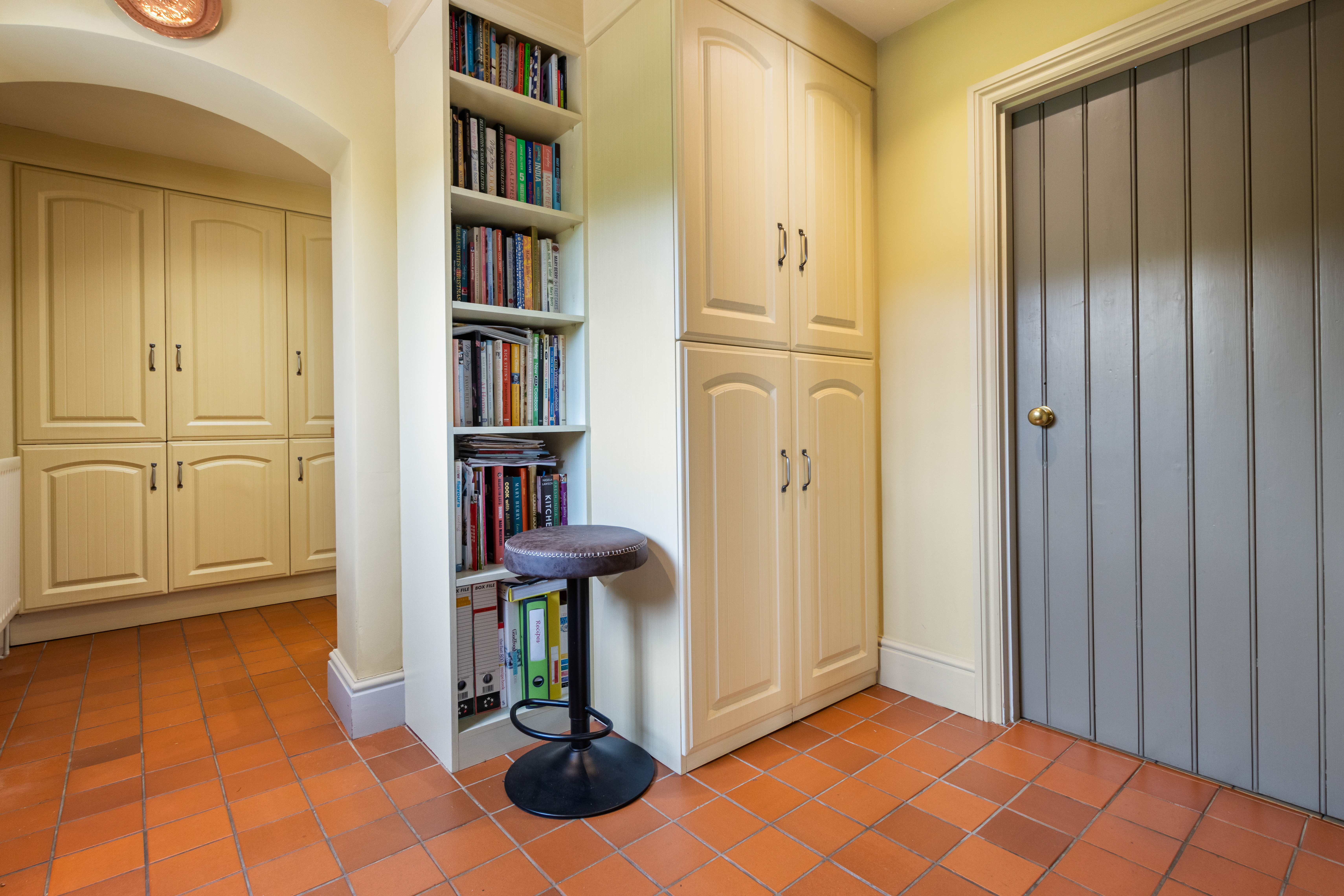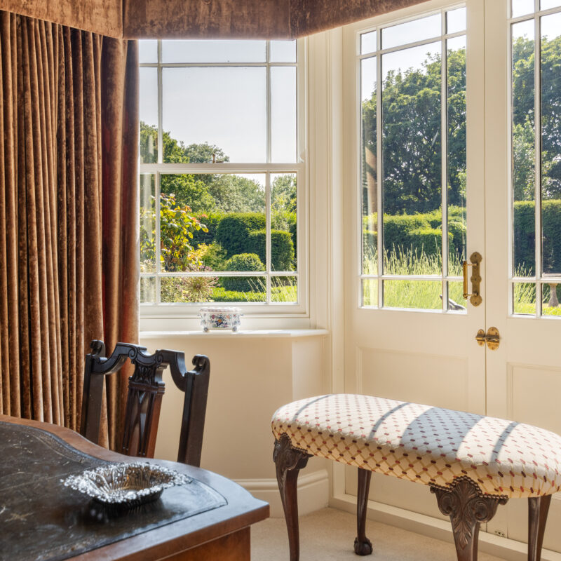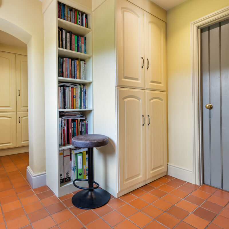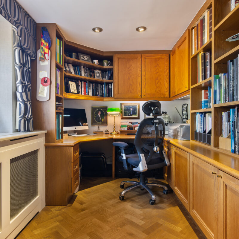 Fully fitted out office with a range of bespoke solid wooden office furniture by Neville Johnson which comprises of built-in cupboards , book shelving and desk unit, sash window, parquet flooring, recessed spotlights and ledge and brace oak door.