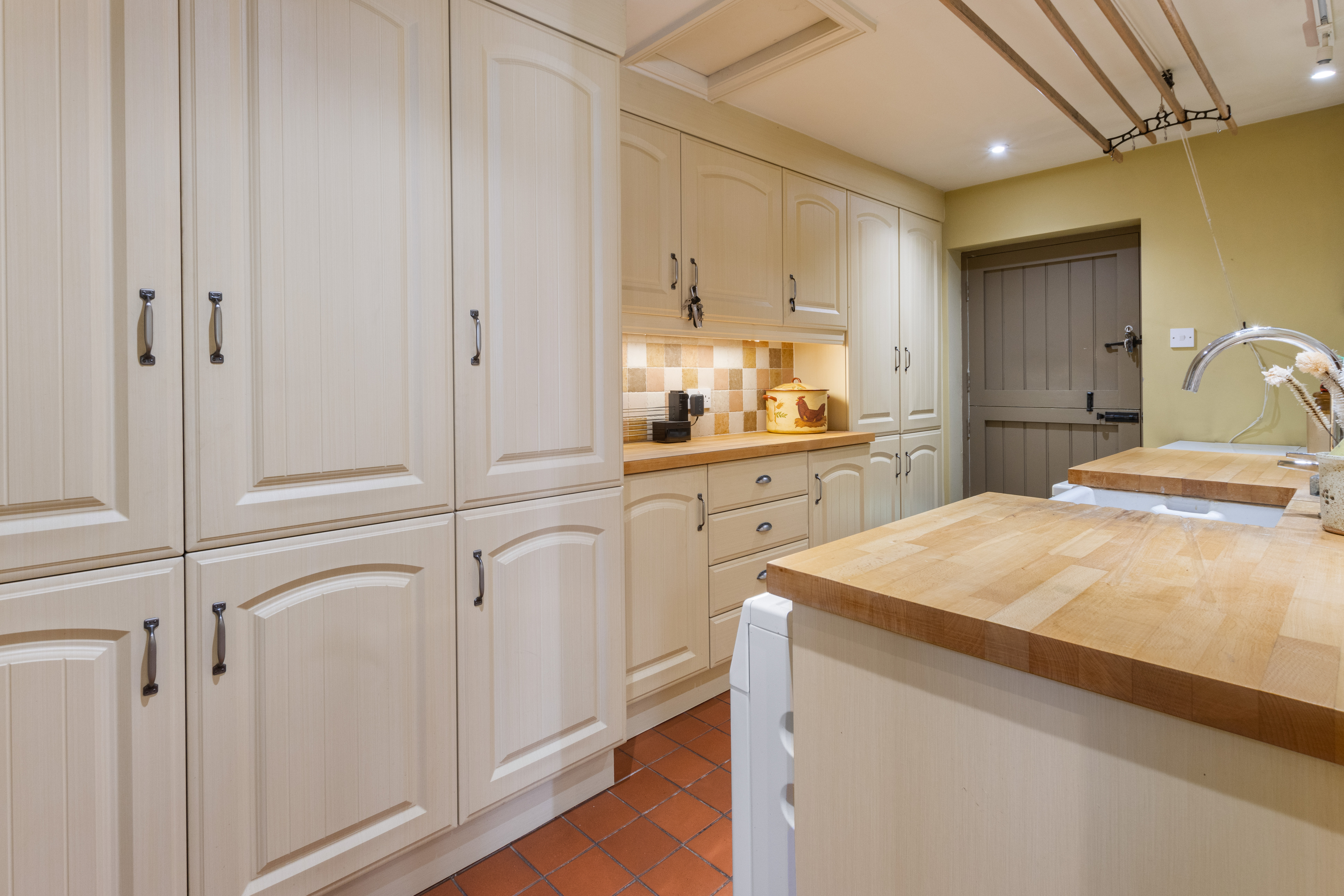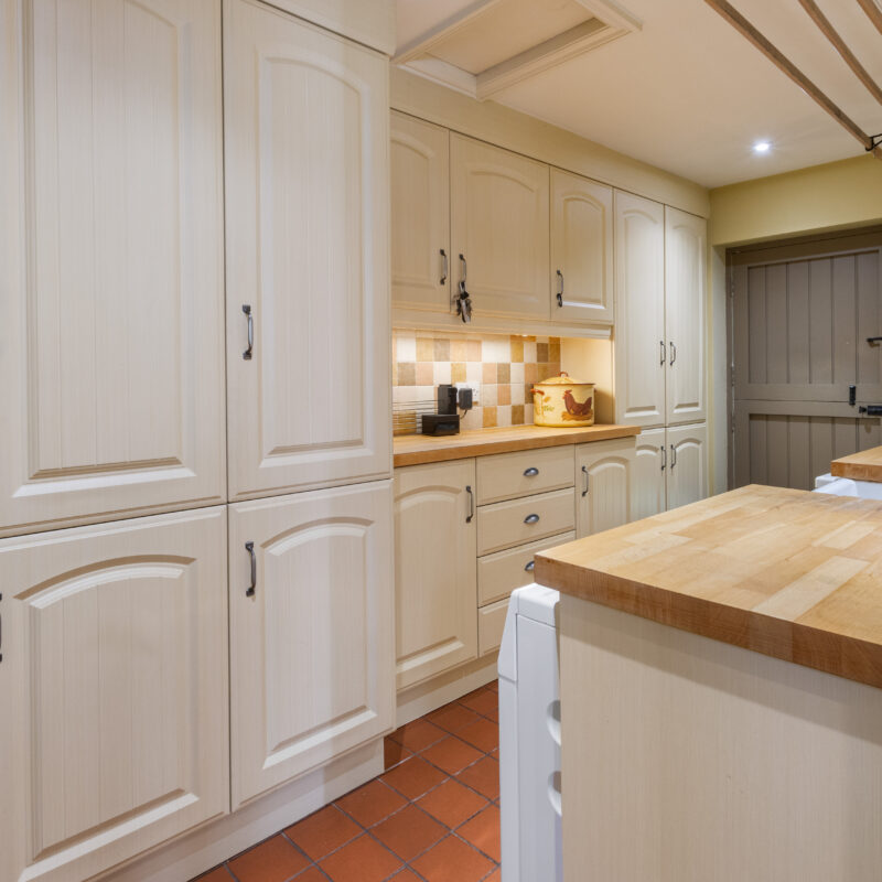 With stable style external door, fitted wall and base cupboards with block wood worktops, porcelain sink with mixer tap and draining board, tiled splashback, plumbing for washing machine and space for dryer, radiator, access to roof space, tiled floor, oil fired central heating boiler and timer control.