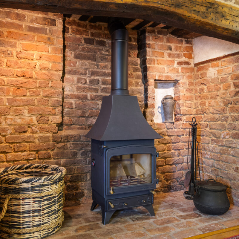 With impressive large Ingle nook fireplace providing the focal point to the room with shaped wooden beam and housing a solid fuel stove,oak flooring, sash window, radiator, ceiling beams and wooden door openings to:- (measurements into chimney recess)