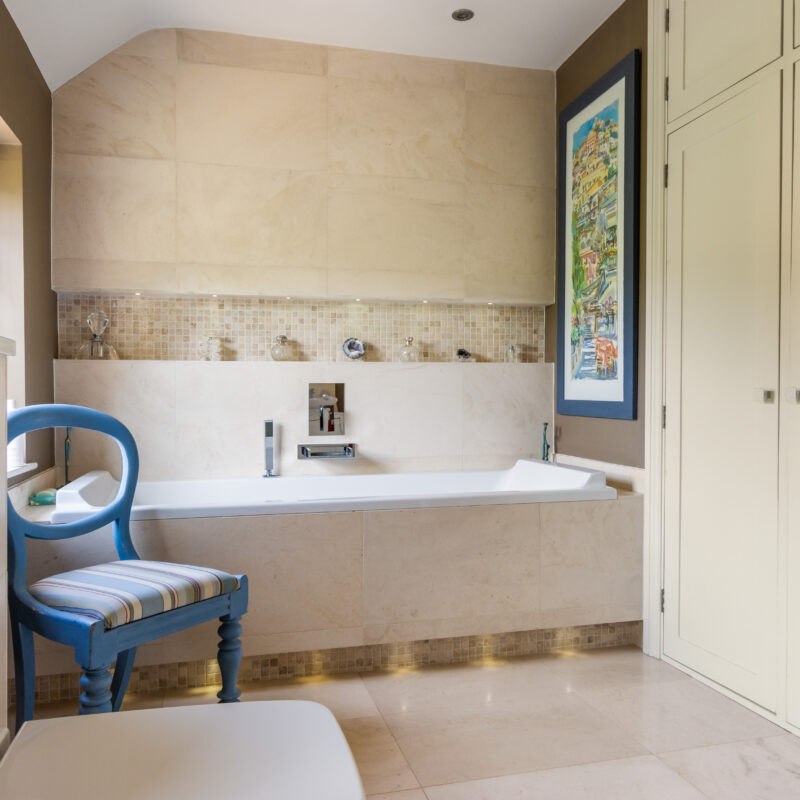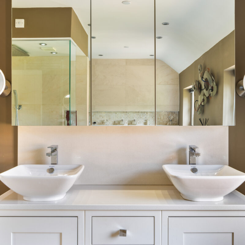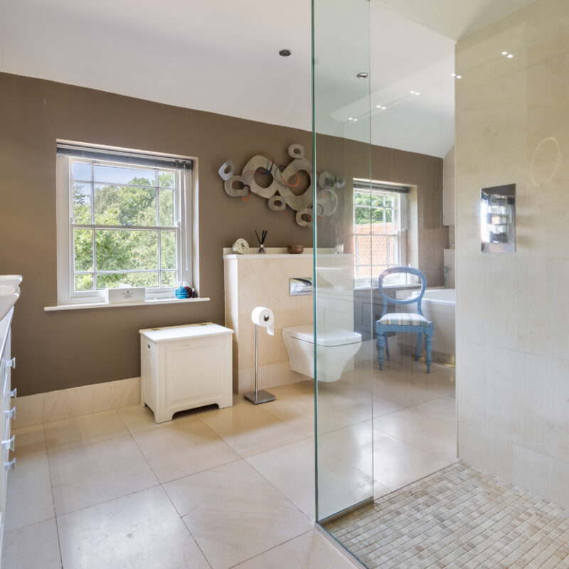 Fitted by Richard Sutton designs and having a large walk-in shower & tiled walls, held shower as well as a large rain shower over, close couple toilet with concealed cistern , his and hers wash basins set on a granite top & with fitted cupboard below as well as an illuminated mirror over , tiled panel bath with tiling over and having a central water tap and handheld shower attachment as well as under bath lighting, two sash windows, recessed spotlights, Built-in airing cupboard housing hot water cylinder, chrome heated towel rail/radiator and under floor heating.