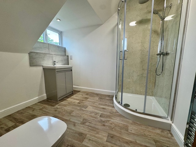 With newly fitted three-piece suite comprising of lined shower cubicle having mains fed shower , vanity wash basin, close couple toilet, heated chrome towel rail/radiator, uPVC double glazed window and extractor fan. Maximum measurements into sloping ceiling.